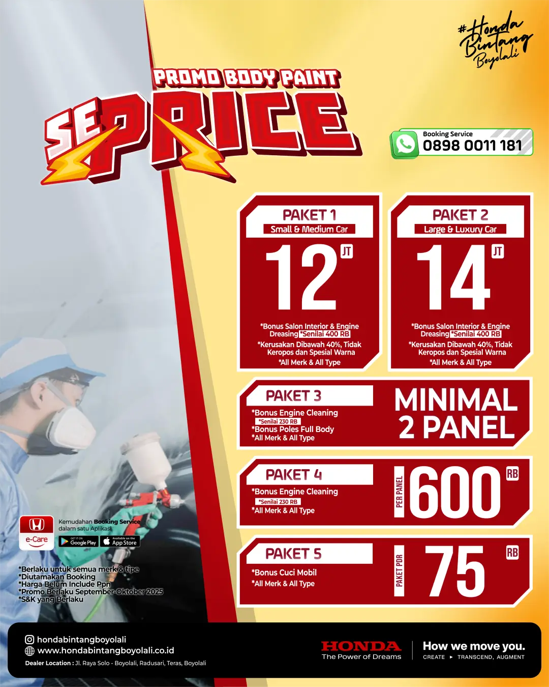 Bagi pemilik mobil, tampilan eksterior adalah salah satu hal yang paling membanggakan. Cat yang mulus dan berkilau bisa meningkatkan rasa percaya diri saat berkendara. Namun, sering kali biaya body paint membuat sebagian orang menunda perawatan ini. Kabar baiknya, di bulan September 2025, Honda Bintang Boyolali menghadirkan promo spesial SEPRICE (Service Hemat Spesial Price) Body Paint untuk semua merek dan semua tipe mobil.