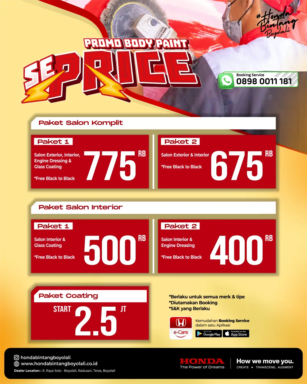 Tampil percaya diri dengan mobil mulus kini bukan lagi hal yang mahal. Dengan promo SEPRICE Body Paint Honda Bintang Boyolali, kamu bisa memilih paket sesuai kebutuhan, mulai dari full body paint, per panel, PDR, hingga salon interior dan exterior. Semua tersedia dengan harga hemat plus bonus yang sangat menguntungkan.